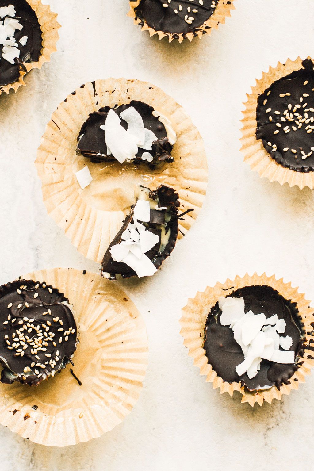 Evenly divide the rest of the chocolate between each liner, topping the tahini. You may need to add part of the chocolate, freeze, and then finish topping the cups to create a smooth chocolate top. Sprinkle sesame seeds or coconut flakes on top of the melted chocolate. Freeze until you’re ready to eat them!