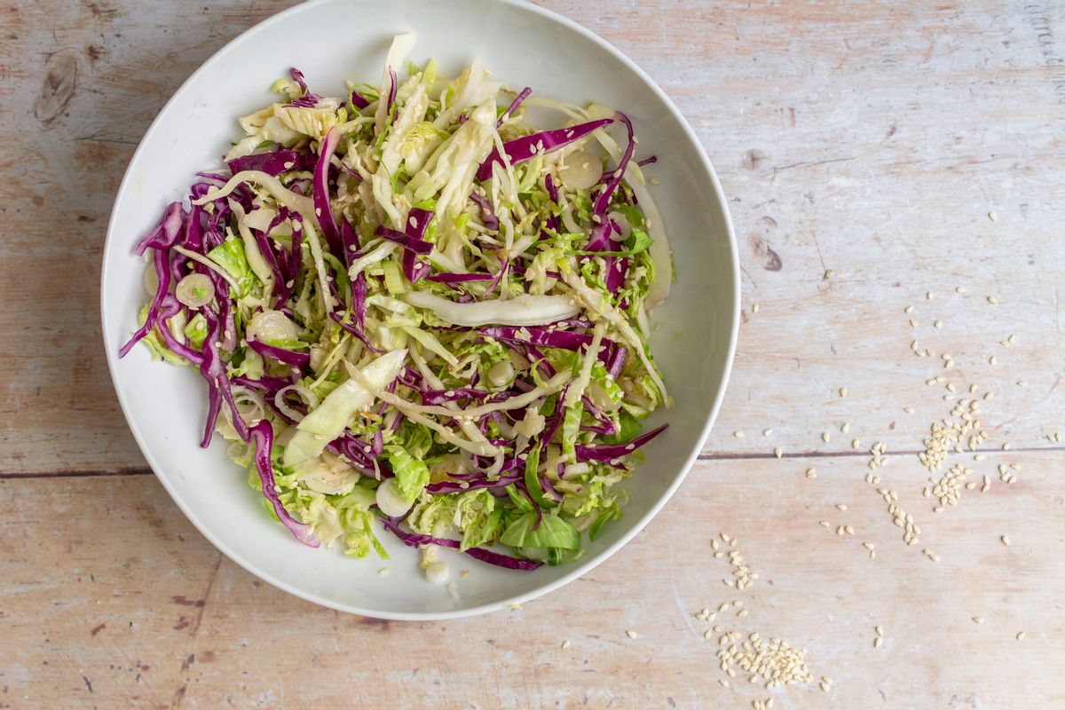 This low carb slaw is packed with raw Brussels sprouts, crunchy red and white cabbage and coated in a zesty tahini and sesame dressing.
