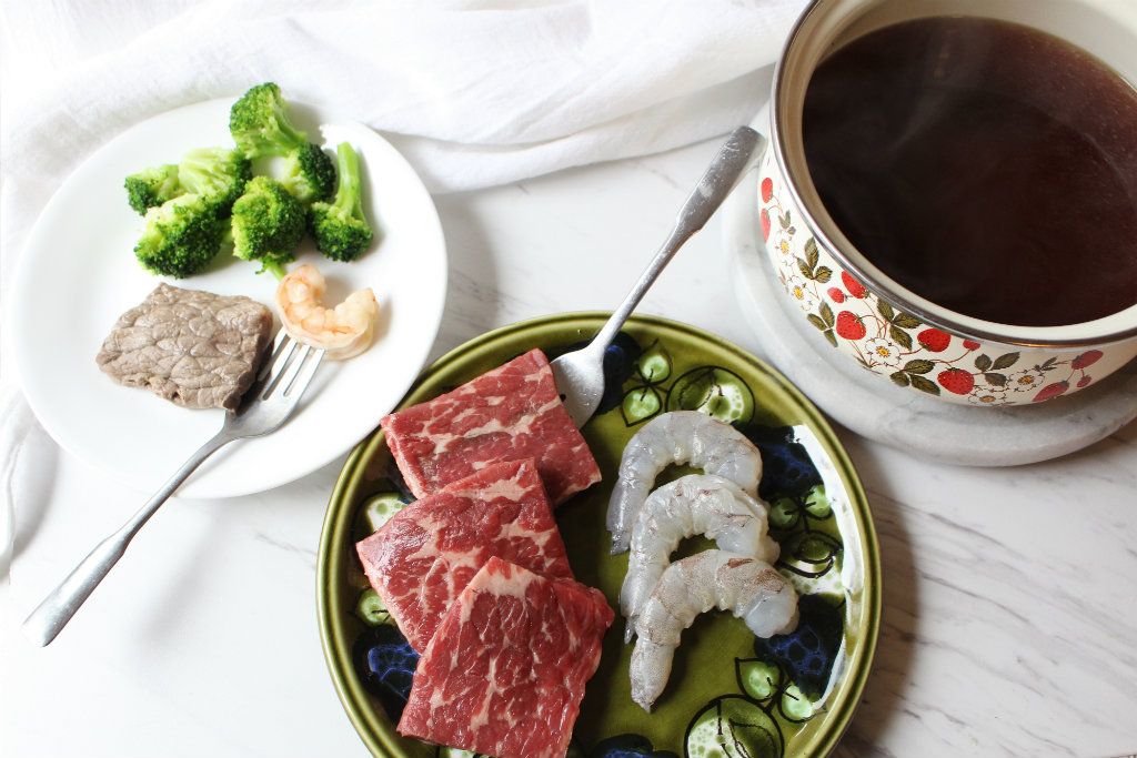 While the broth is heating, prepare 4 pieces of 1-ounce steak and peel 4 raw shrimp. At this time, prepare any other dipping items you intend to enjoy like keto vegetables or other proteins.Step 3