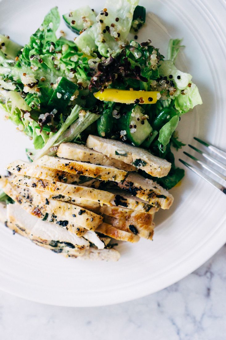 This meal is one of my favorites in my household and is on a weekly rotation. I love how the salad and chicken can be prepped ahead of time to save time on weeknights, but still, eat healthily. I like to cook the quinoa off early to allow it time to cool in the fridge. That way, I can assemble the salad at any time. The chicken is best marinated for at least an hour or overnight. The recipe starts with 3.5 pounds of raw chicken breasts which cooks down to the amount shown in the recipe’s ingredient list, which is done for nutritional purposes.