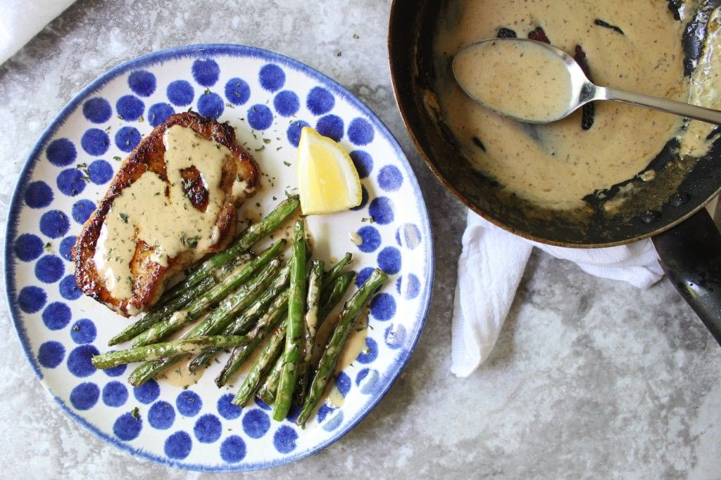 Set the pork chops aside to cool, leaving all excess fats in the pan. Melt the second amount of butter into the pan over a low heat. Stir in the cream and whisk until the fats have emulsified.Step 4
