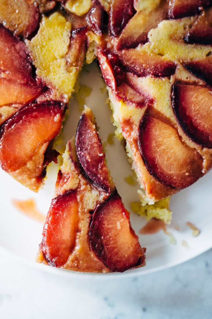 Allow the cake to cool completely before unmolding. When the cake is cool, the cake will pull from the sides of the cake pan making for an easier removal. Run a knife around the outside of the cake. Place a plate on top of the cake pan and flip the cake. Tap the bottom of the cake pan until the cake comes out. If any plums stick to the bottom of the pan, gently remove them and place them on the cake where they belong.