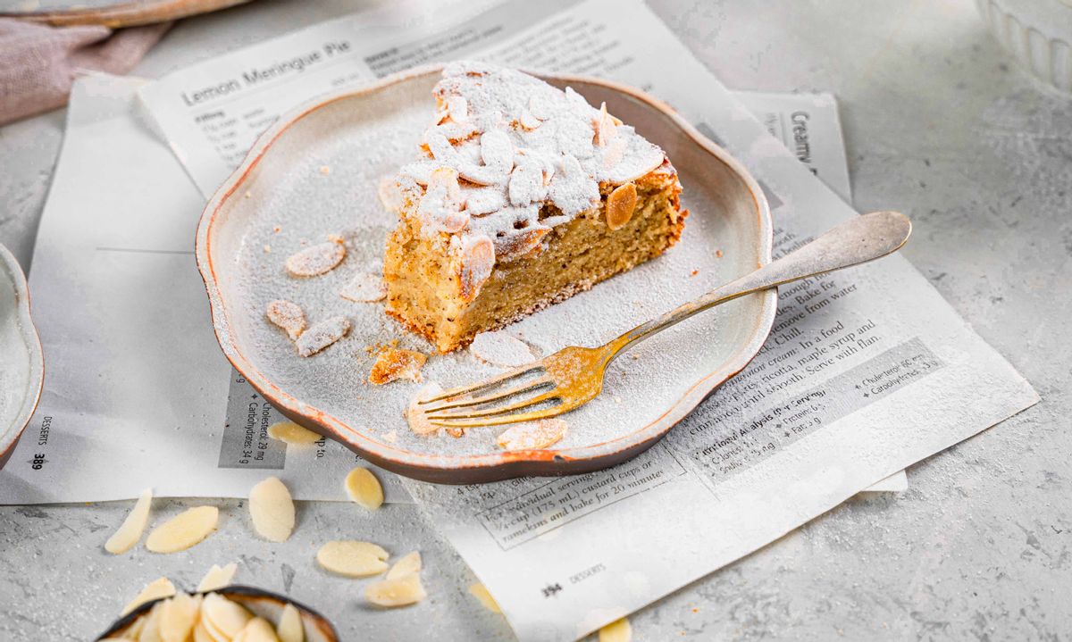 Add in the remaining dry mixture and fold until just combined. Transfer the batter to the lined pan. Spread it using an offset spatula. Spread the sliced almonds on top.Step 5