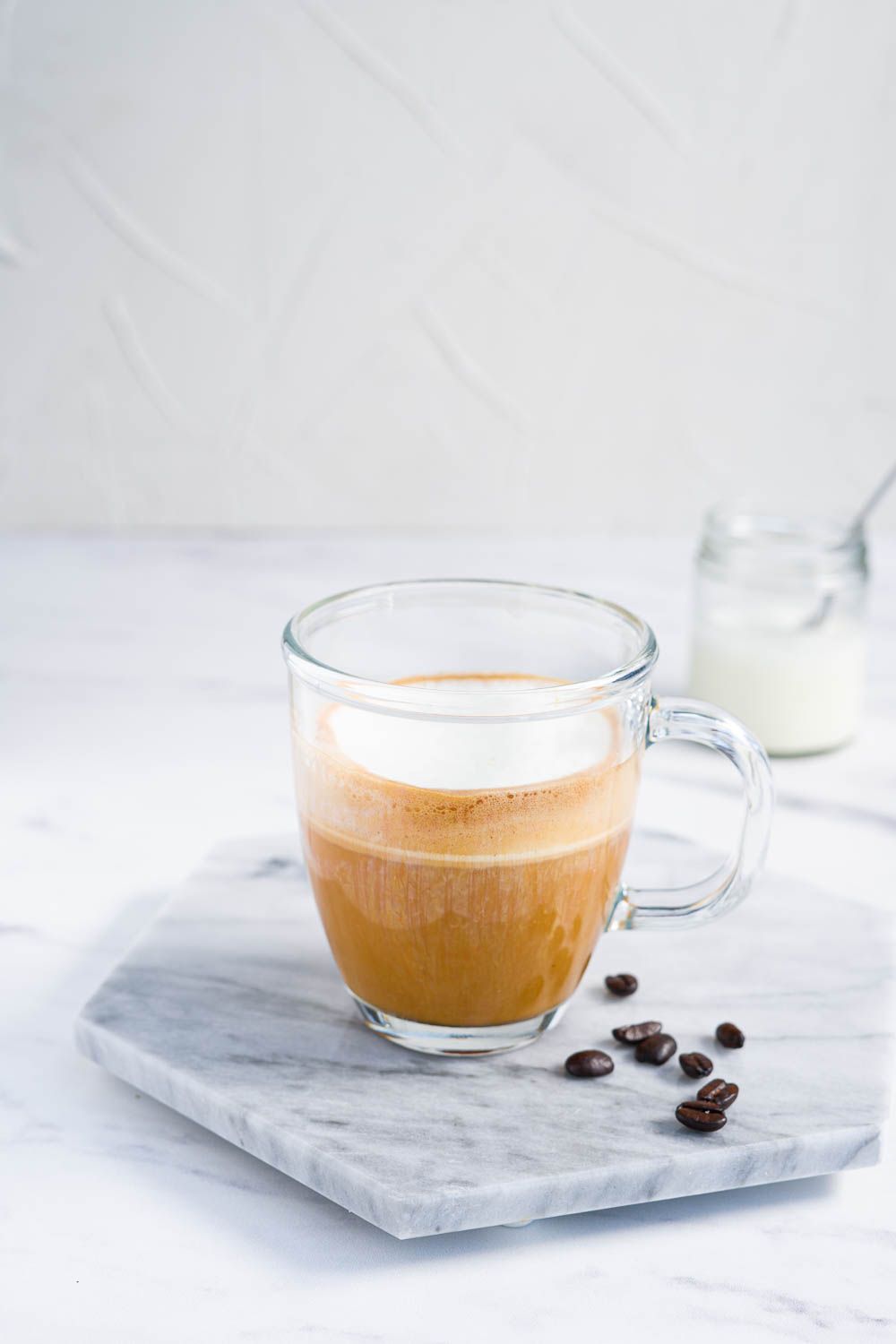 Add ¼ of the frothed cream mixture (or about 3 tbsp non-frothed cream)to the coffee. garnish the top with a few coffee granules. Serve immediately!