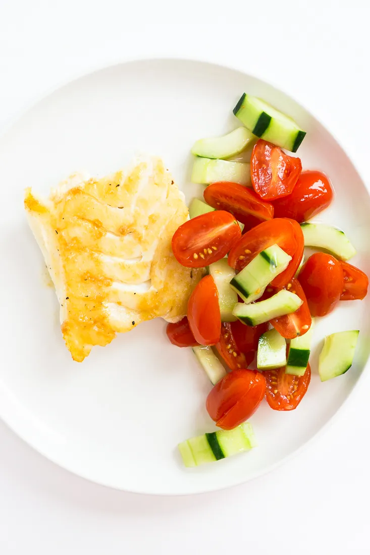 Keto Salt & Pepper Cod With Cucumbers + Tomatoes