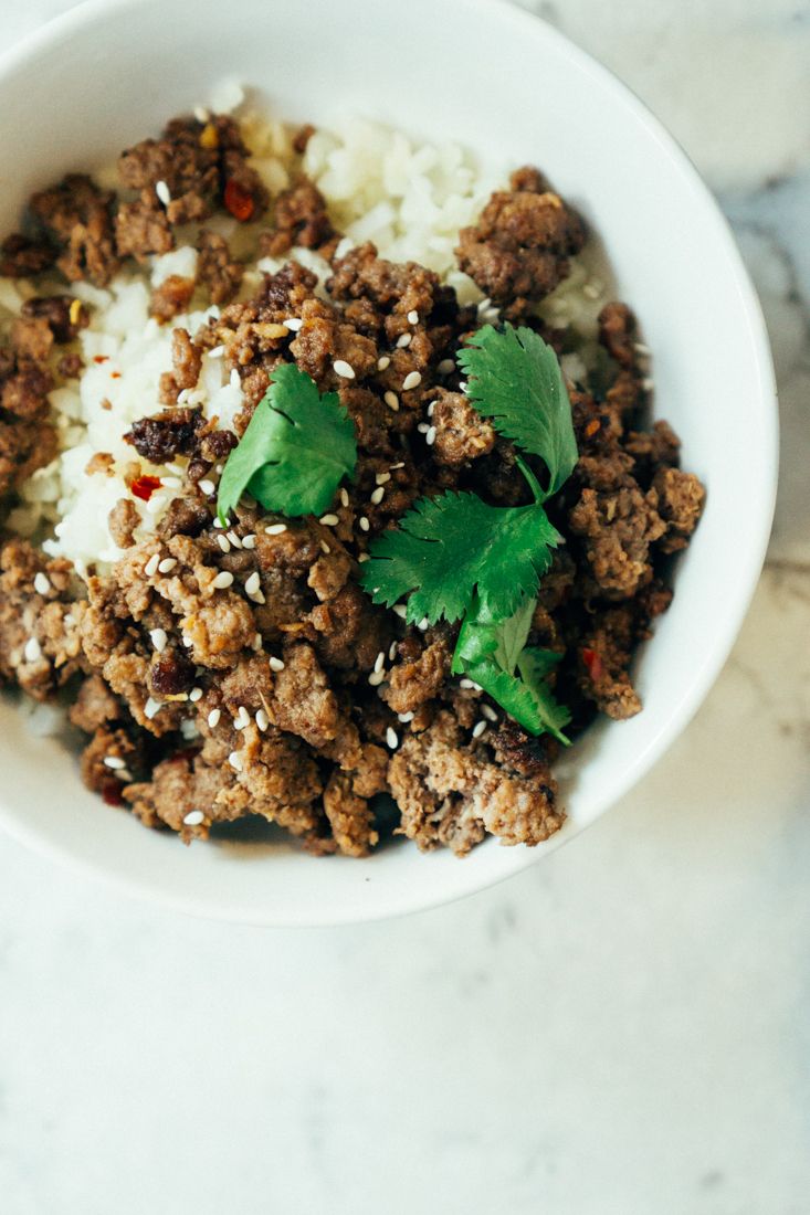 Heat the cauliflower rice in the microwave until hot. Divide into four bowls and divide the beef on top of the four bowls. Top with sesame seeds and fresh cilantro.