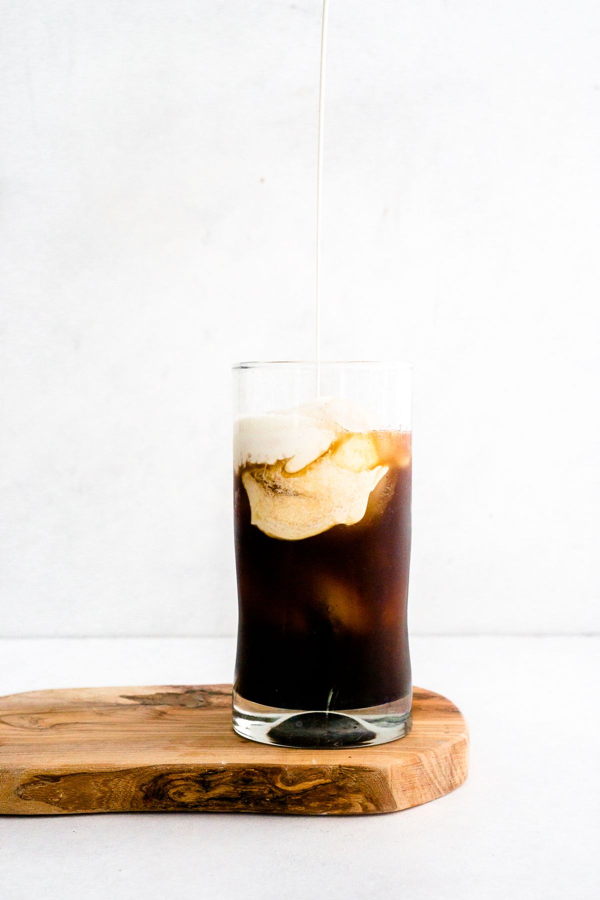 To serve, fill a glass with ice. Add a serving of cold brew and equal parts cold water. Add the cream and allow it to swirl around in the glass, serve immediately!