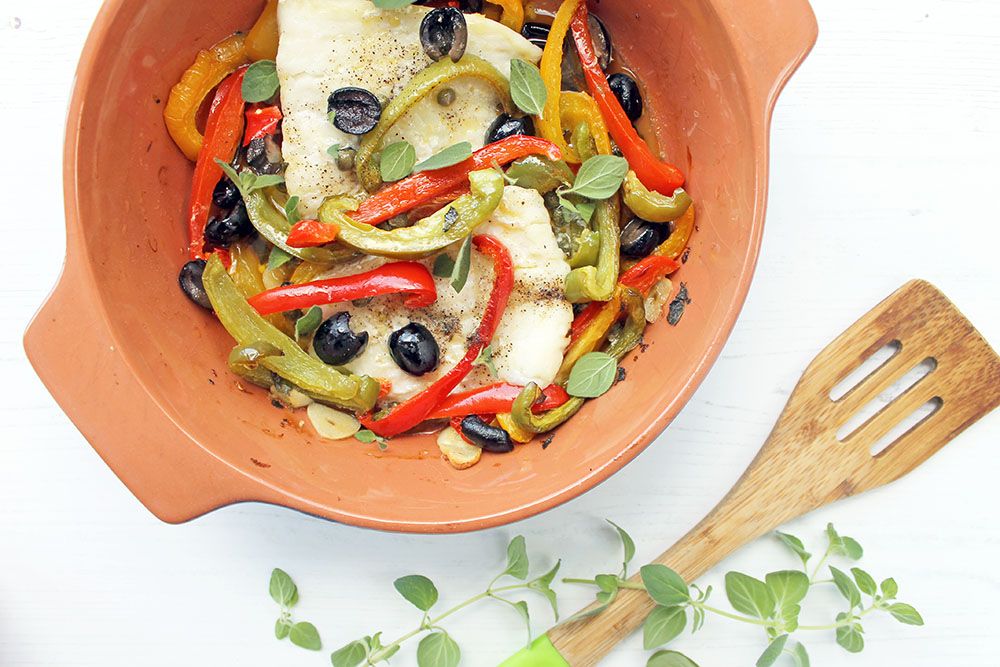 This simple one pot dinner is rich with classic Mediterranean inspired flavors, from salty capers to sweet peppers and aromatic oregano.