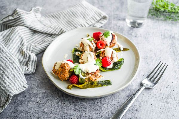 We swapped the pomegranate seeds (high in carbs and sugar) with raspberries to keep with the traditional colors of this dish but keeping it low carb.