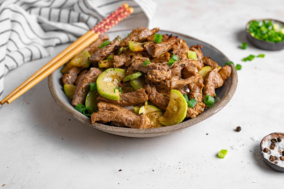 Transfer the cooked beef to the plate with the zucchini and add the remaining tallow. Repeat the previous step with the remaining meat. Once cooked, return the zucchini and first batch of beef to the wok.Step 5