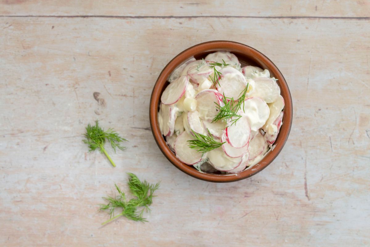 This keto take on potato salad is packed with flavor from aromatic scallions and fresh dill, crisp radish, salty capers, and a hint of lemon.