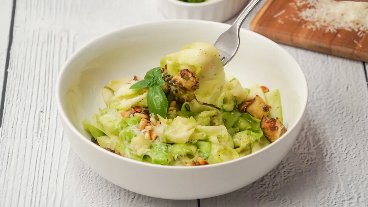 This easy Keto summer recipe uses zucchini ribbons in place of carb heavy pasta noodles. The zucchini ribbons are tossed with tender roasted eggplant, aromatic fresh basil, crunchy toasted pine nuts and shavings of parmesan cheese. The warm salad is then drizzled with extra virgin olive oil and a little lemon juice to serve.
