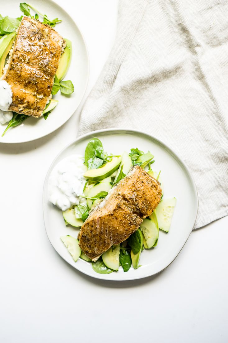 The Indian spices in the dish lend itself so well to fatty, delicious salmon. This meal would also be a great one to meal prep! The salmon is baked in the oven, which gives you time to prepare the salad and cucumber mint sauce. The flavors of the cucumber avocado salad are amazing, crunchy and crisp at the same time with a nice tangy dressing. The cucumber mint yogurt sauces puts the meal over the top! One note, be sure to purchase garam marsala that is sugar free! Use two 6 oz salmon fillets.