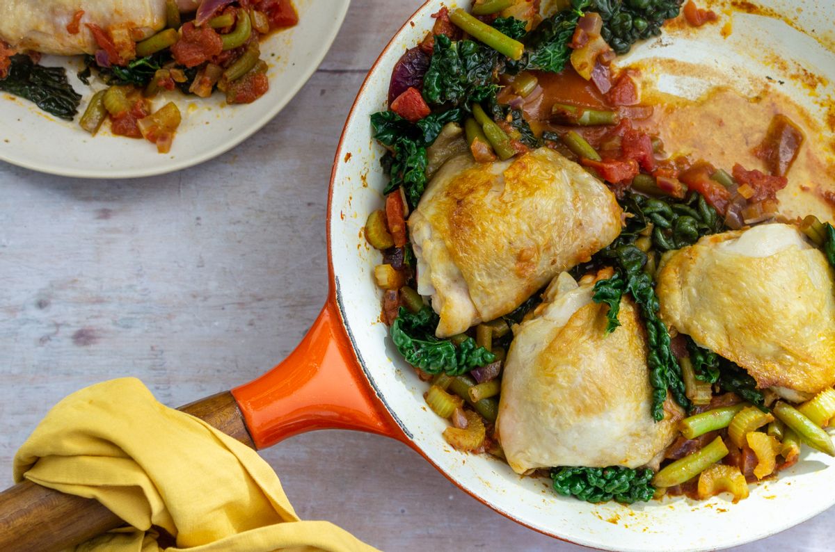 This flavorsome Keto chicken stew is rich in fats, low carb veggies, and Italian inspired flavors. Our low carb stew is prepared with skin-on chicken thighs, aromatic garlic, onion, celery, tender green beans, Tuscan kale and simmered in a tomato and chicken stock sauce with a hint of balsamic vinegar. This makes a flavorsome Keto lunch or dinner option served with your preferred low carb sides.