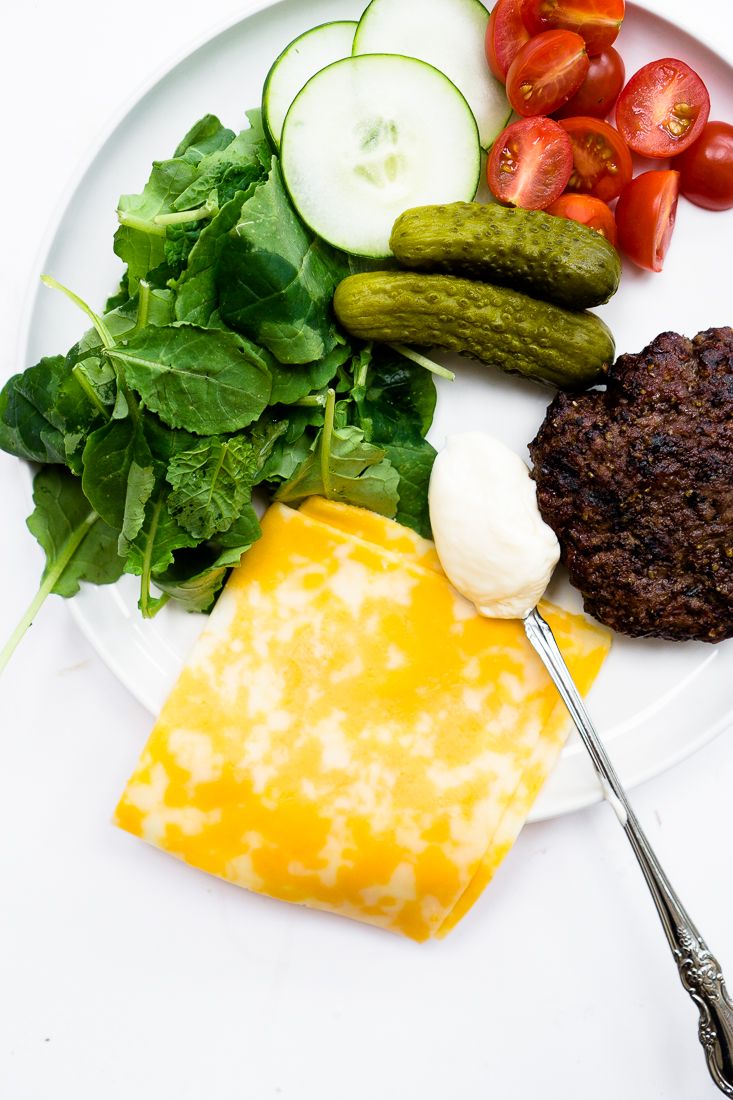 Who needs a bun when you could have a burger plate? This meal is super easy to put together for several people. The plate includes an addition of baby kale greens, tomatoes (which are optional), a couple slices of cheese, pickles and mayo!