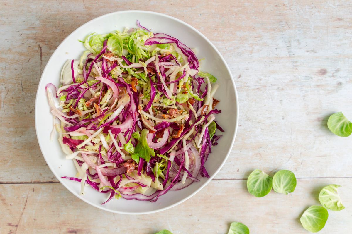 Slice the base from the sprouts and discard. Thinly slice the sprouts, onion and cabbage and add to a mixing bowl. Toss to combine.Step 3