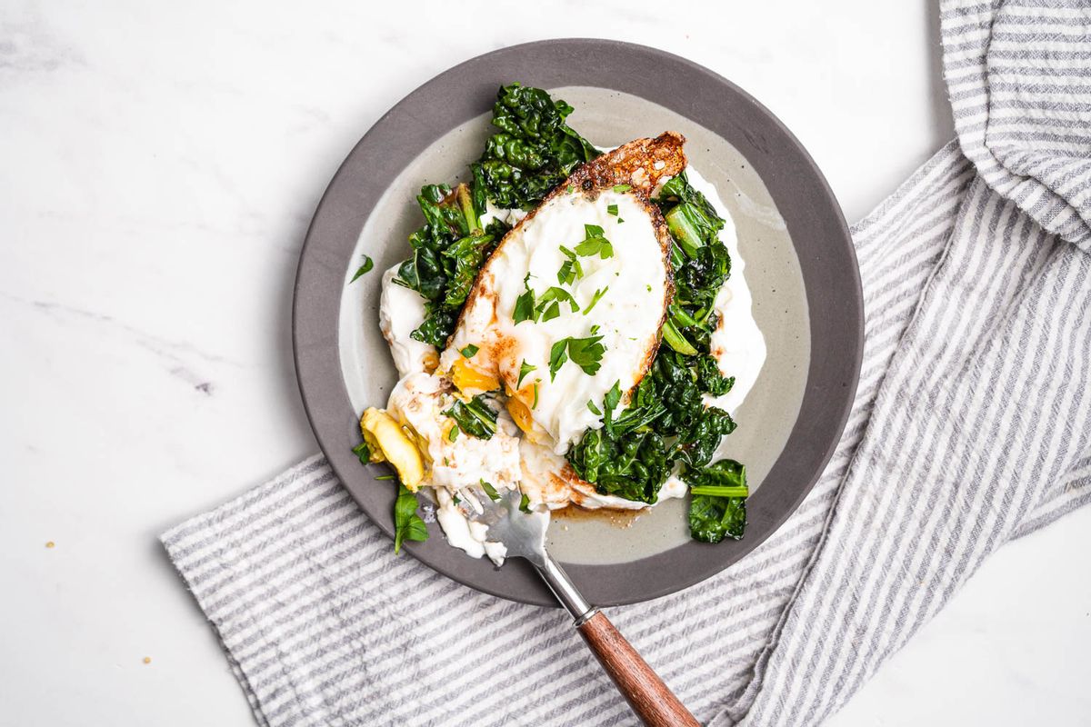 Keto Crispy Egg with Greens Over Yogurt
