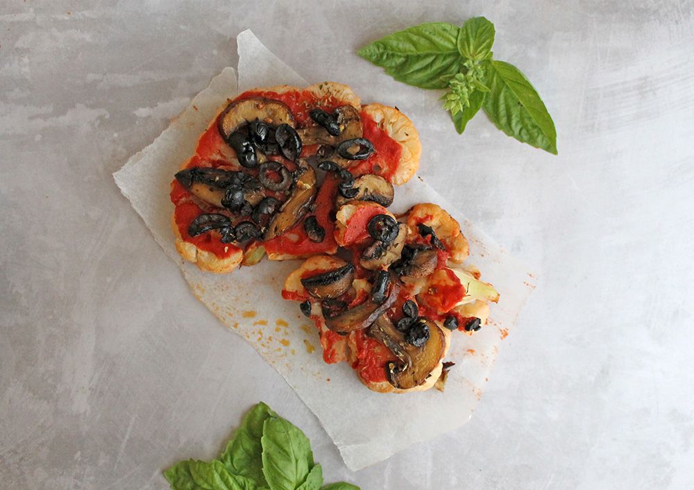 This simple cauliflower steak is loaded with pizza inspired toppings of salty olives, sweet tomato and tender mushrooms.