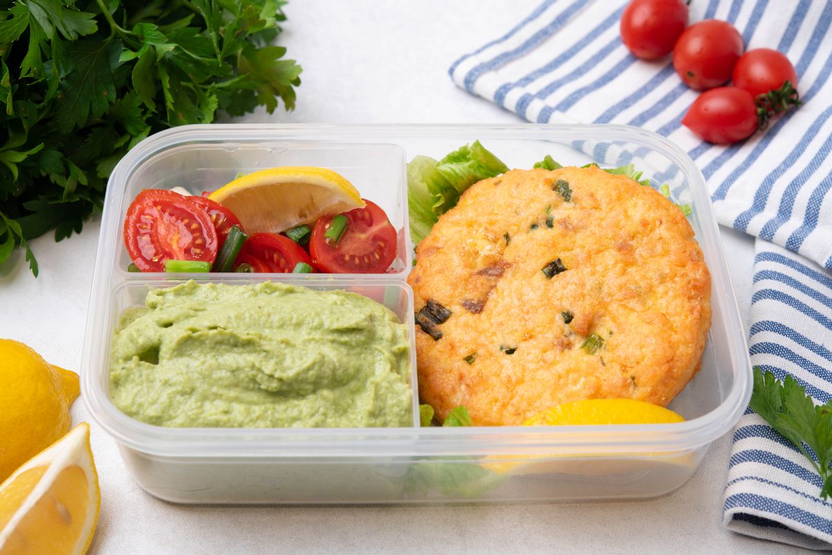 Divide the salmon patties and broccoli mash between your lunch boxes. Add the cherry tomatoes and optionally add some spring onions and lemon. Enjoy!