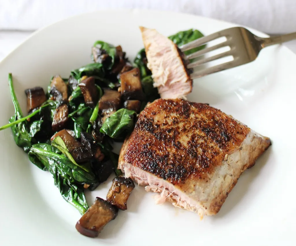 This full dinner is great for meal prepping but simple enough to make fresh for a nice dinner. Easily double this recipe to have enough for the family or cut in half for a meal for one. Thick tuna steaks are seasoned and grilled to almost-blackened and paired with a buttery, savory side of spinach and mushrooms.