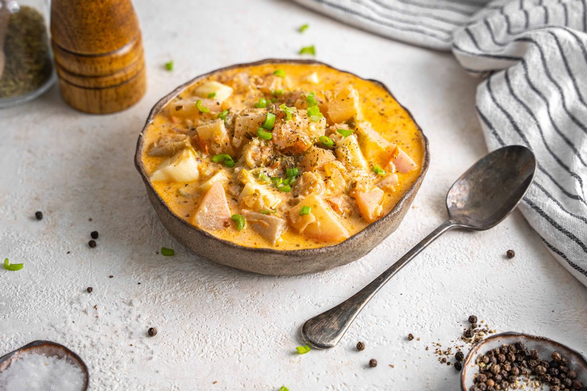 Caldo de queso is a cheese and potato soup native to the Mexican Sonora region. It is made of roasted green chilies, potatoes, and chunky cheese pieces simmered in chicken broth and garnished with cilantro. It is usually served with flour tortillas or bread. To make this Mexican classic Keto, use low-carb alternatives such as radishes and small amounts of parsnip in place of potatoes and serve with low-carb bread and tortillas instead.