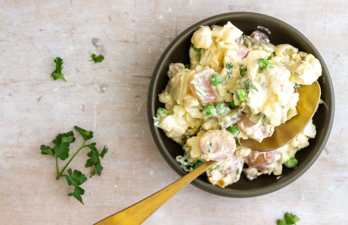 Russian salad is typically made with potatoes, carrots, eggs, pickles, fresh herbs, and mayonnaise. Occasionally some salads also include ham and variations on the vegetables. For our adaptation of this classic dish, we have substituted the carb-heavy potatoes with cauliflower and swapped the carrots for radish. We have used fresh parsley in our adapted salad, but this would also work well with fresh dill. Please be sure to adjust your macros to account for any changes made to the original recipe.