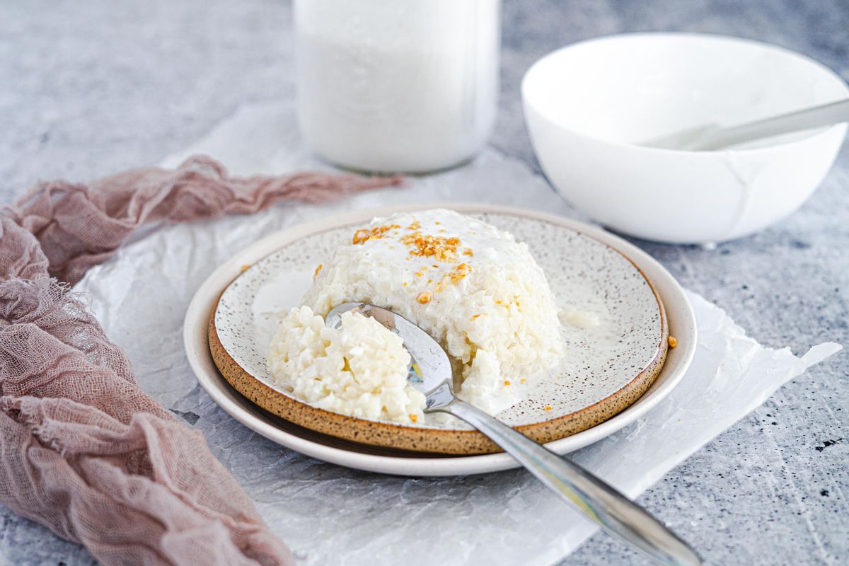 Place the cauliflower rice in a medium-sized microwave-safe bowl. Combine it with 0.5 oz of canned coconut milk, monk fruit powder, and a pinch of salt. Stir well to combine. Microwave the mixture on high for 1-2 minutes until very hot.Step 2
