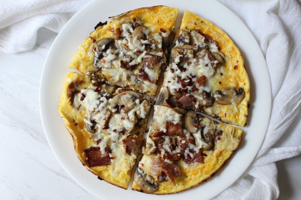 Is it breakfast? Lunch? A snack? This omelette pizza can be any meal you want it to be! Make the start to your day a little more savory and filling, or you can have breakfast for dinner. This “pizza” is topped with bacon and sauteed white mushrooms, and everything is glued together with melted mozzarella cheese.