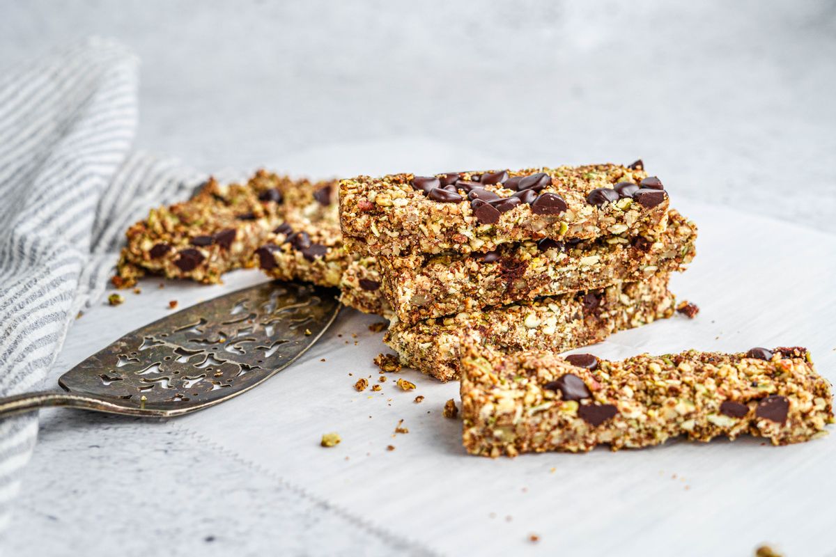 If you have been on the Keto diet for a while, my guess is that you miss granola bars! However, you can have the best of both worlds with our Keto Chocolate Chip Granola bars! A combination of chopped nuts like pecans, pumpkin seeds, and walnuts are blended together to form a crumbly mixture that is held together with an egg white, ground flaxseeds, and almond butter which is also sweetened with monk fruit. The mixture is pressed hard into a cake pan and baked until nicely golden brown and delicious! Pecans give such deliciously sweet and caramelized flavor when toasted! The pecans paired with the stevia-sweetened chocolate chips are very reminiscent of chocolate chip cookies, in our opinion!