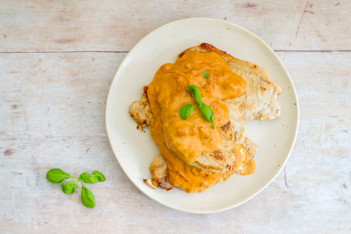 These quick and easy one pan pork loins are topped with a rich and creamy tomato sauce with hints of aromatic oregano.