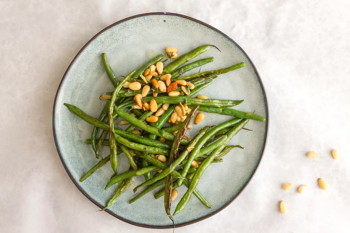 These simple but flavorful green beans are sautéed in garlicky butter with crunchy golden pine nuts.
