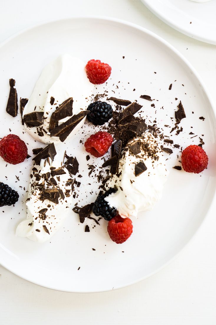 This dessert looks fancy, but it is not any harder to make than whipping heavy cream! Simply add homemade lightly sweetened whipped cream to a plate into spoonfuls and top with berries and chopped dark chocolate. It is a sweet and elegant way to end a nice meal.