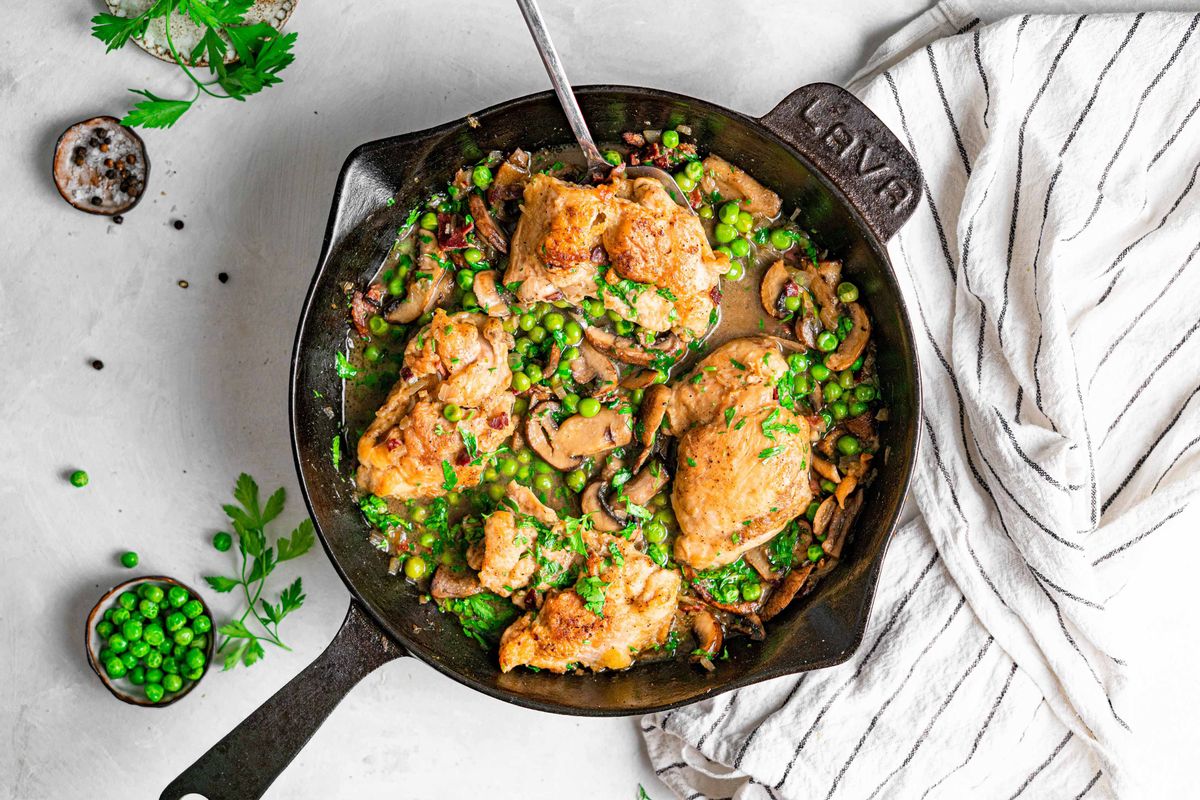 This chicken and mushroom skillet is an easy and mouthwatering dinner option perfect for a Low-GI Keto diet. The juicy chicken thighs pair perfectly with the savory sauce, umami mushrooms, and sweet peas. This chicken recipe yields a fancy, delicious, and hearty meal without the extra effort. It is one of our favorite Keto chicken recipes because it takes under 30 minutes to prepare and is cooked in one skillet.