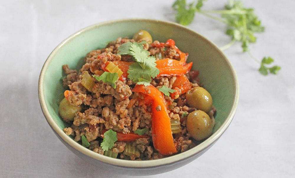 This keto take on Cuban beef picadillo is rich with aromatic spices, tender bell pepper and stuffed green olives.