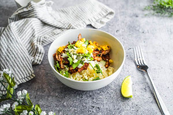 Slice the meat into thin slices and place them on top of hot cauliflower rice. Sprinkle with cotija cheese and some of the diced pineapple. Add a squeeze of lime on top of each bowl. Top with the cilantro/onion mixture. Feel free to add salsa which is not calculated into the macros above.