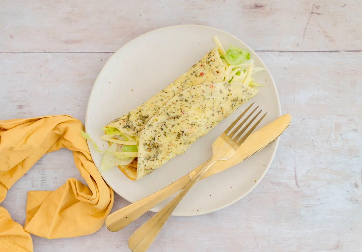 This Keto egg tortilla is a great guilt free option for loading with your favorite hot or cold fillings. Why not try with a hearty Italian inspired filling of lettuce, tomato, prosciutto and olives. Alternatively fill with pan fried peppers and rotisserie chicken.