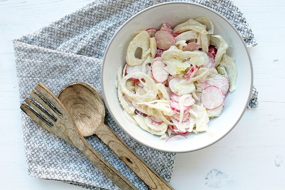 This light and refreshing salad is prepared with finely sliced radish and fennel, dressed in a zesty mayonnaise dressing.