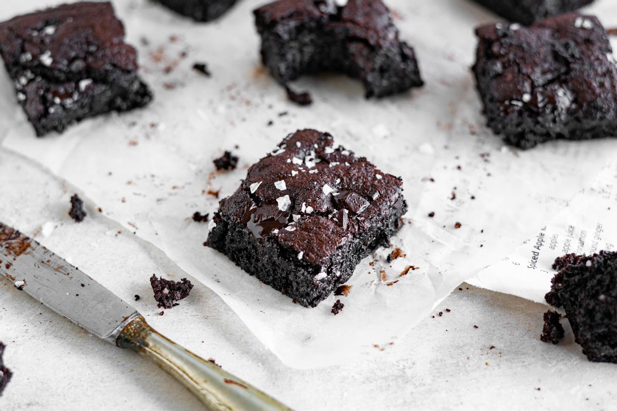 Let the brownies cool completely in the pan for at least an hour. Take the brownies out of the pan with the help of the parchment paper, and cut it into 9 squares. Sprinkle with some salt flakes (optional). Serve immediately or store in an airtight container.