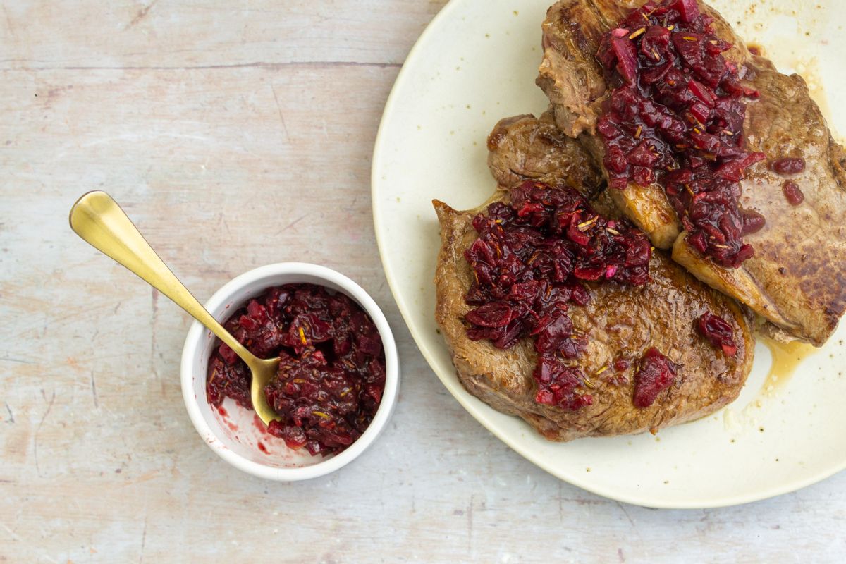 Just before the dressing has finished cooking, you can prepare the steaks. Heat a skillet over a medium/high heat. While the skillet is heating, rub the steaks in olive oil and season on both sides with salt and pepper. Place the steaks in the hot skillet and cook for 2-3 minutes each side for medium-rare or cook through to your preference. Set the steaks aside to rest for a few minutes, then top each with cranberry relish to serve.