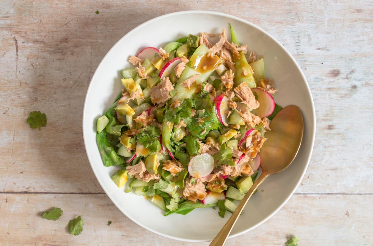 Flake the tuna into the salad and stir through.Step 4