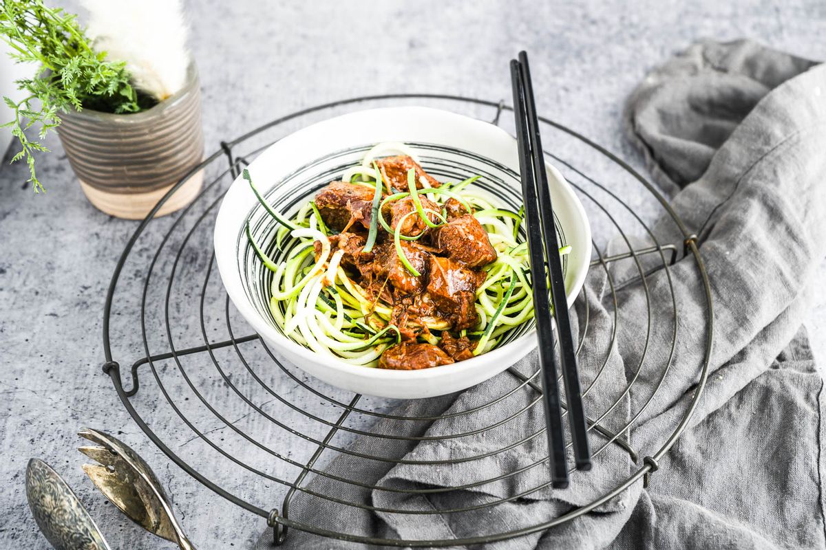 In the meantime, spiralize the zucchini noodles and set them aside in the fridge. Right before serving, add a couple of pinches of salt to them and cook them in the microwave in 30-second intervals until slightly cooked. Serve noodles with hot Chinese braised beef and sauce.