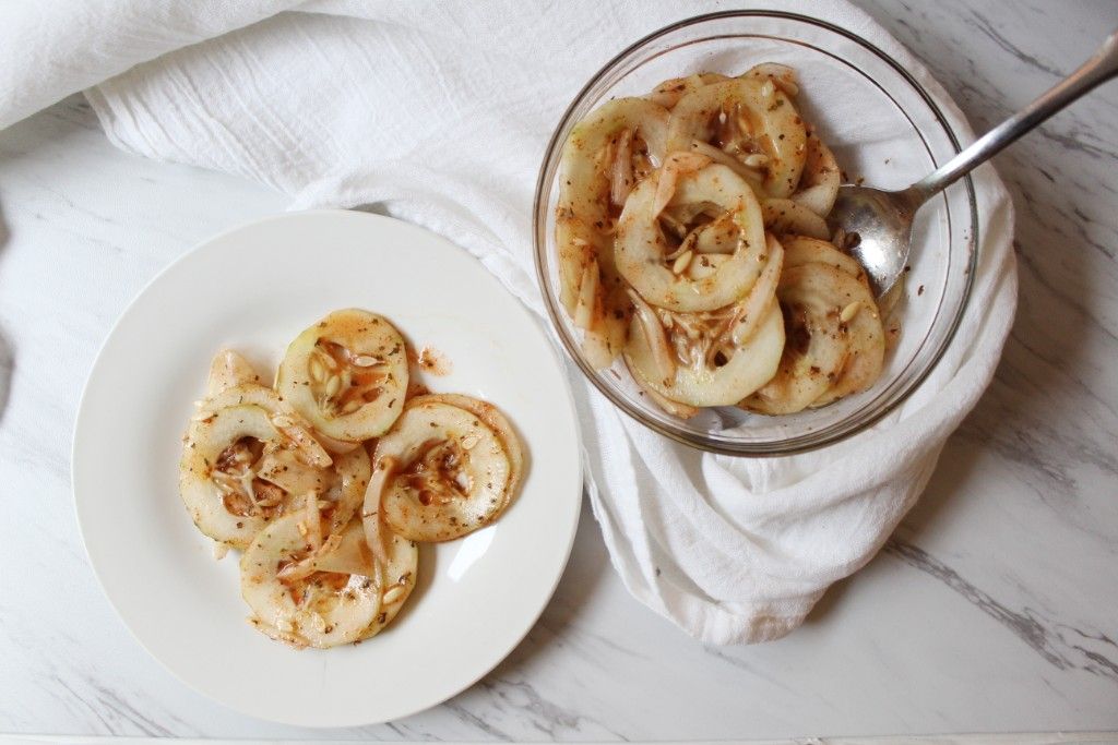 Thinly slice the cucumber and white onion. Mix in a bowl. Stir in the remaining ingredients and continually combine until the cucumber and onion are completely coated in the flavorings.Step 2