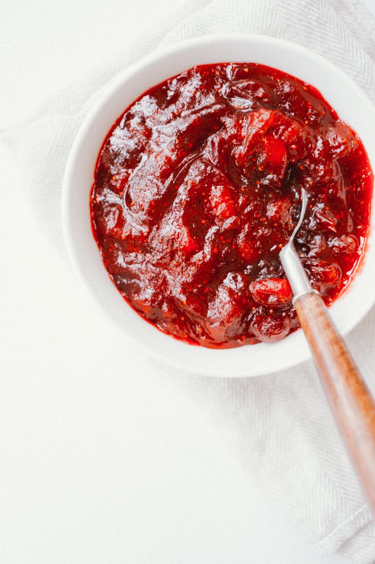 Cranberry sauce is the perfect pairing for turkey on Thanksgiving! This version is more tart, so if you like it a little sweeter add an additional ¼ cup of sweetener.