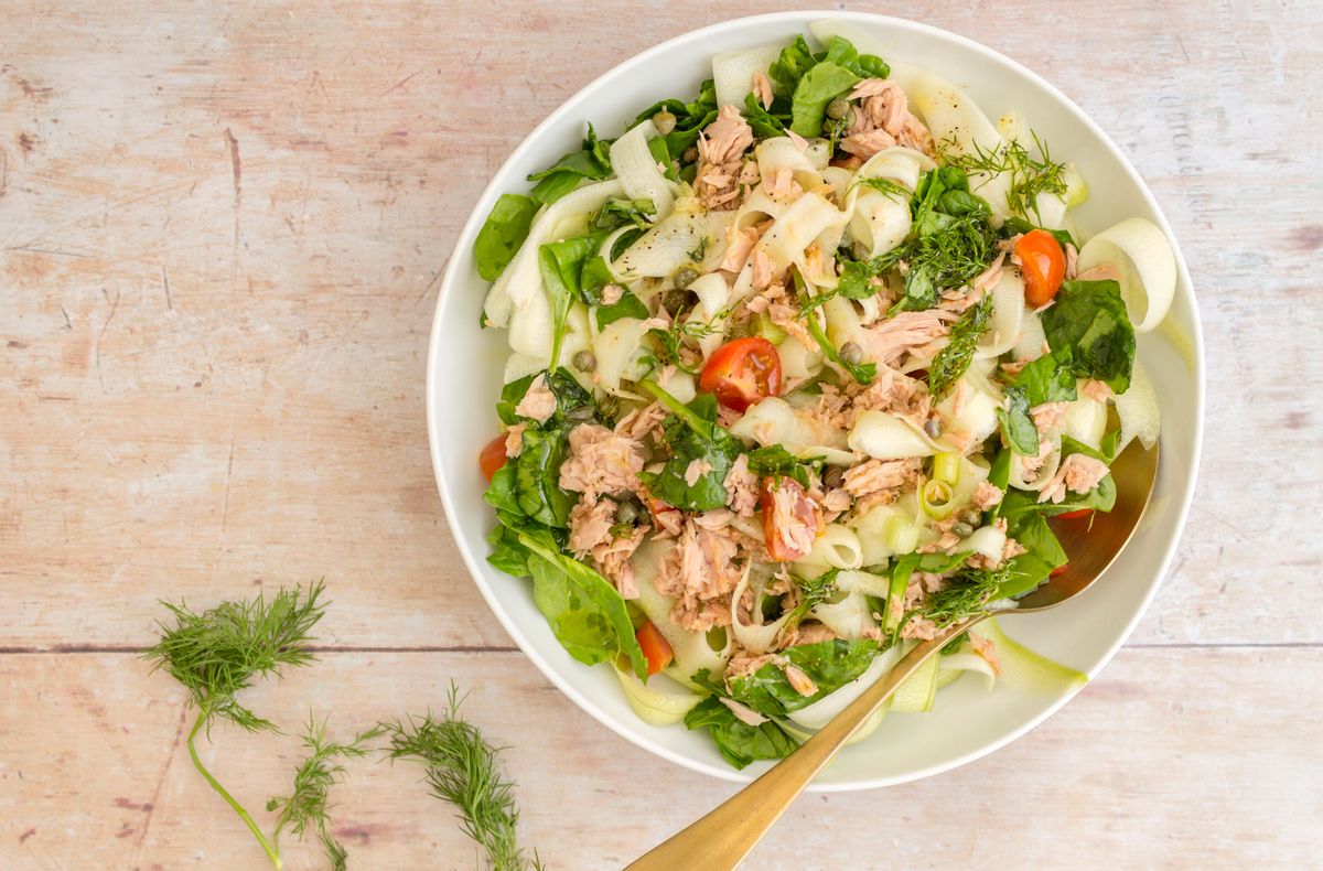 This quick and easy pasta salad uses zucchini to create a noodle base and is tossed with flaked tuna, salty capers, tender spinach and juicy tomatoes.