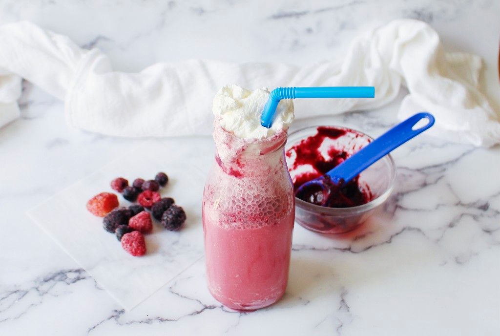 Add frozen mixed berries to a small pot, then fill the pot with about ½” of water. Bring the pot to a simmer on the stove until the berries become super soft and can be broken down with a wooden spoon. Remove the pot from the heat, pour the ingredients into a blender, and blend the berries and water until everything is macerated.Step 2