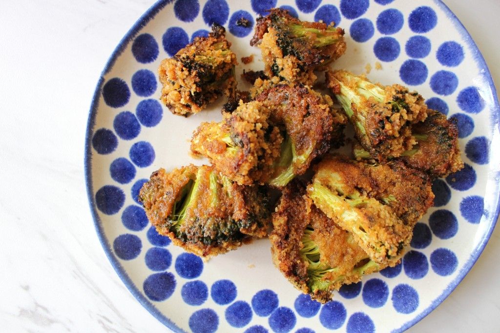 Preheat an oven to 400 degrees. In a food processor, pulse the pork rinds until you have a fine, crumbly breading. Set this aside on a plate for breading the broccoli in Step 3.Step 2