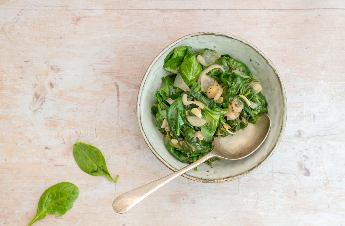 This buttery keto spinach is pan fried with sweet shallots, aromatic garlic and zesty lemon until tender and fragrant.