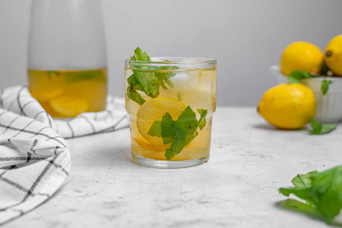 Iced green tea with mint, ginger, and lemon is a nutritious and revitalizing beverage for those warm days. One glass will quench your thirst and provide you with abundant antioxidants. Making iced tea with green tea, as opposed to black tea, gives you a mellow and aromatic flavor with added health benefits.