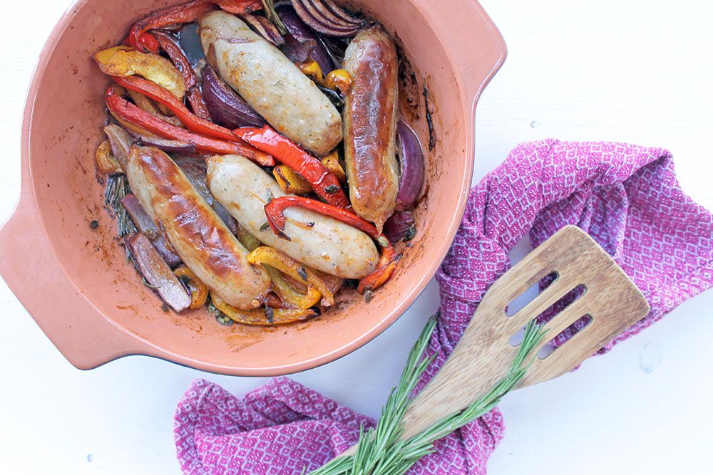 Transfer to the oven to bake for 25-30 minutes until the vegetables are tender and the sausages are completely cooked through.