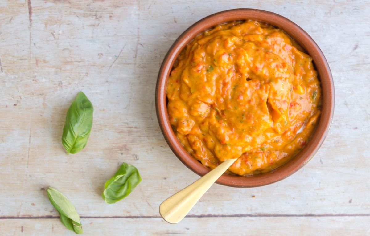 This Mediterranean inspired bell pepper dip is packed with creamy avocado, juicy roasted bell peppers, fresh basil, aromatic garlic, and zesty lemon.
